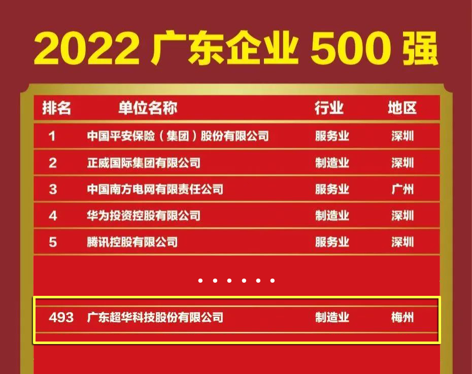 10月12日,廣東省企業聯合會、廣東省企業家協會在廣州發布《2022廣東500強企業發展報告》,廣東超華科技股份有限公司入選“2022廣東企業500強”!